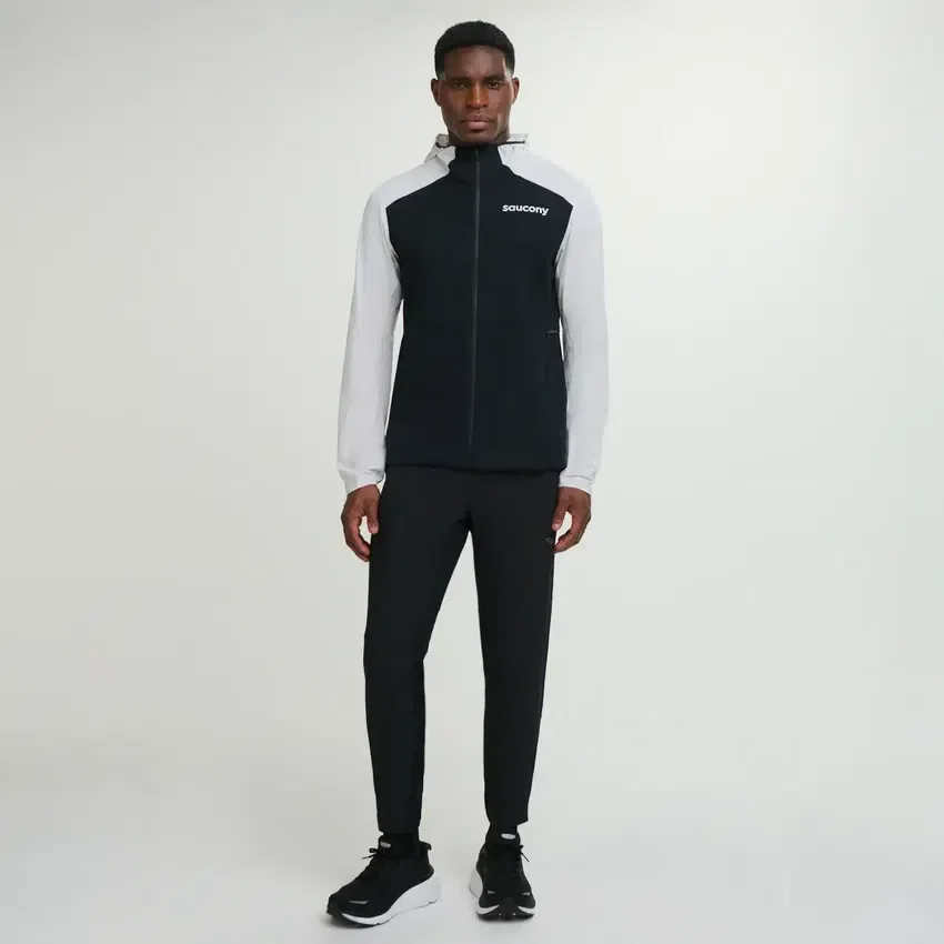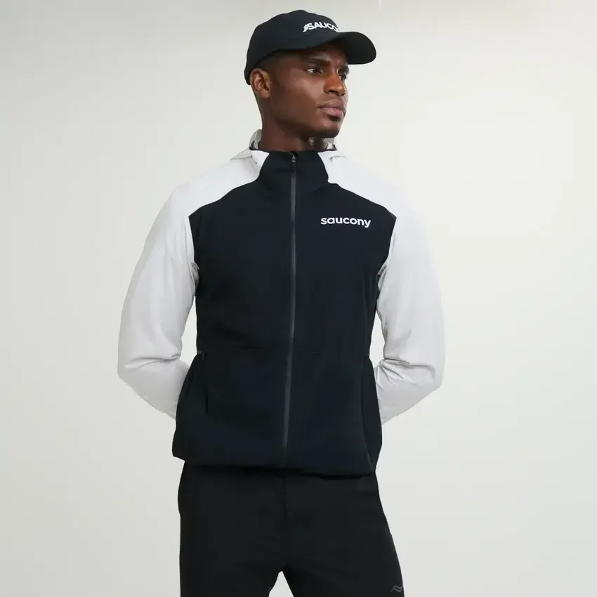 Saucony Hurricane Waterproof Jacket:Lightweight,fully seam-sealed jacket with adjustable hood,vented back,and recycled polyester for weather-ready comfort.